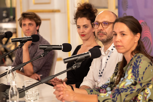 Mednarodno omizje o (digitalni) prihodnosti gledališča. Na fotografiji: Rok Bozovičar, Hannah Zufall, Norbert Rakowski in Maja Nemec