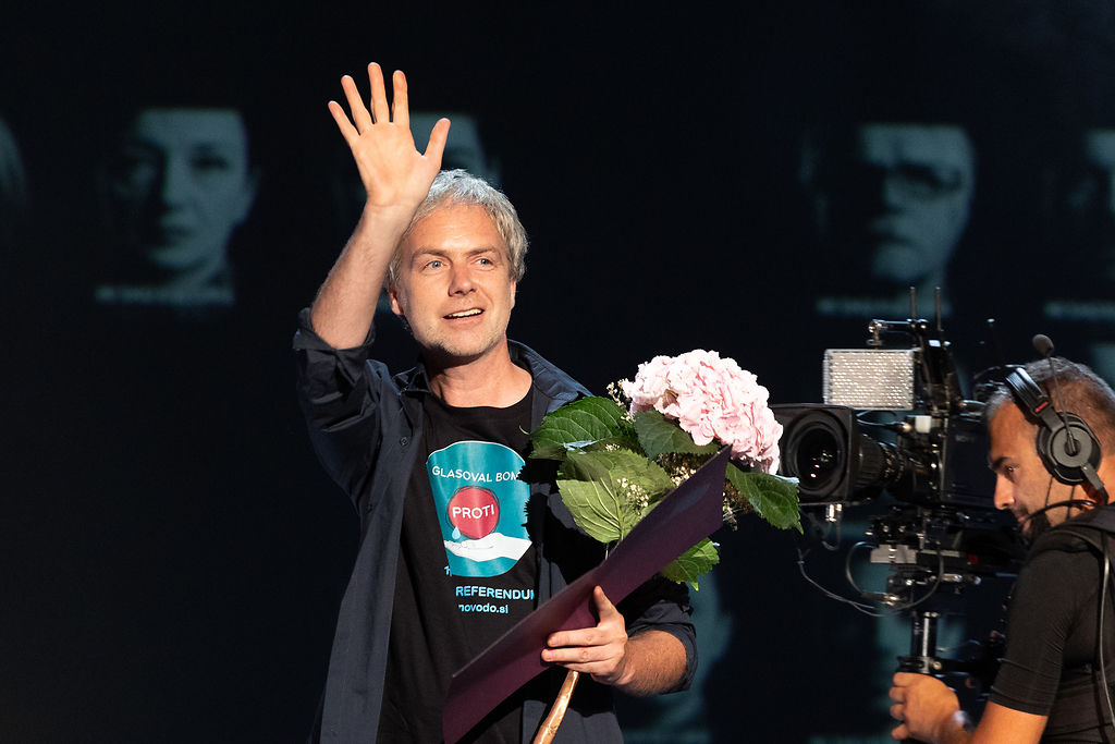 Na fotografiji: Igor Vasiljev ob prejemu Borštnikove nagrade za scenografijo v uprizoritvi Gejm v koprodukciji Slovenskega mladinskega gledališča in Maske Ljubljana