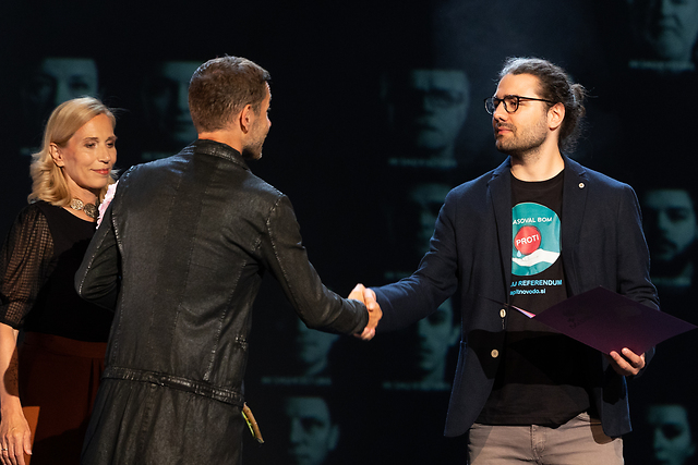 Na fotografiji: Blaž Gracar ob prejemu Borštnikove nagrade za glasbo in oblikovanje zvoka v uprizoritvah Gejm v koprodukciji Slovenskega mladinskega gledališča in Maske Ljubljana in Sedem dni v produkciji Mestnega gledališča ljubljanskega