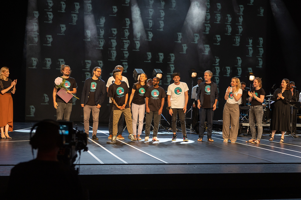 Na fotografiji: ansambel Slovenskega mladinskega gledališča ob prejemu Velike nagrade Festivala Borštnikovo srečanje za najboljšo predstavo Gejm v režiji Žige Divjaka