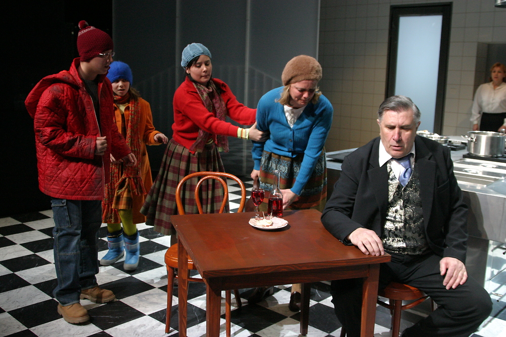 Na fotografiji: Tines Špik (tretji otrok), Mojca Špik (drugi otrok), Ana Špik (prvi otrok), Jette Ostan Vejrup (Lužarica), Franc Markovčič (Jožef Kantor) in Stannia Boninsegna (Hana) v predstavi Kralj na Betajnovi v režiji Zvoneta Šedlbauerja