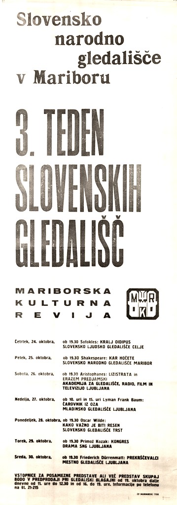 Tretji teden slovenskih gledališč je potekal v Slovenskem narodnem gledališču v Mariboru, od 24. do 30. oktobra 1968. Tiskarna: Mariborski tisk