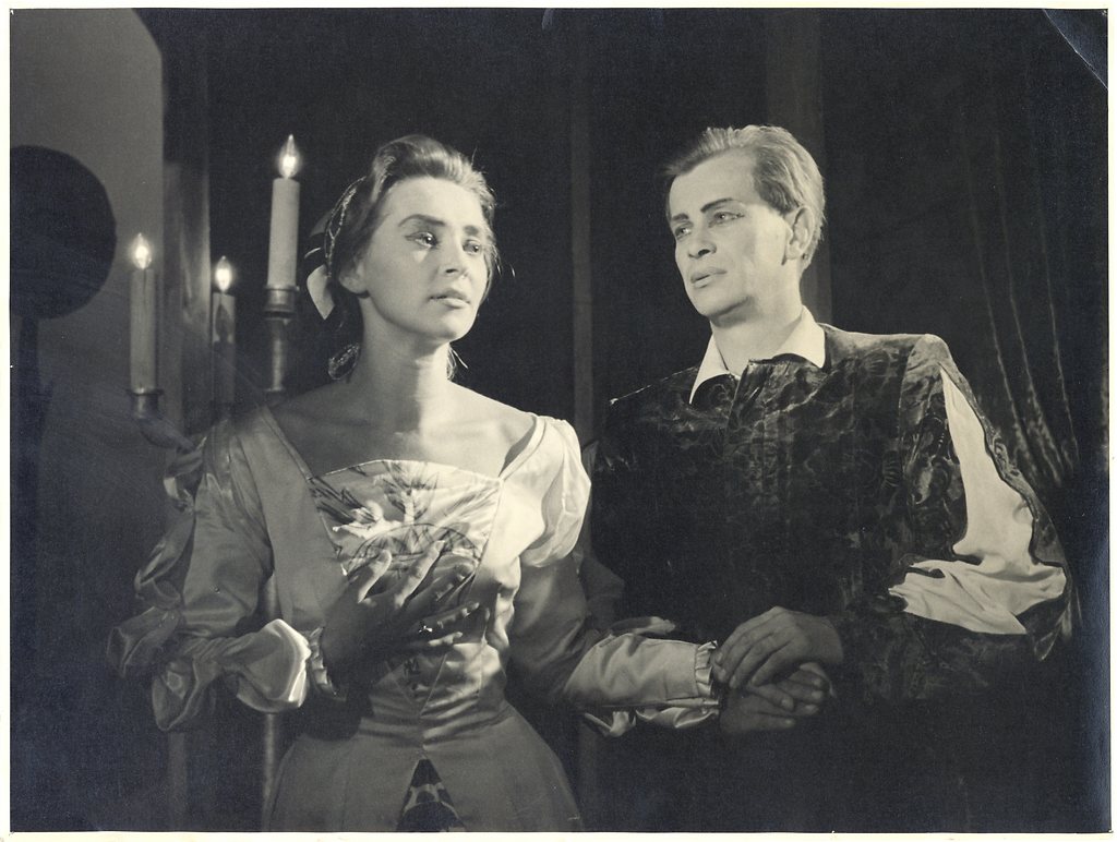 William Shakespeare: Romeo in Julija. Prešernovo gledališče Kranj, 20. 9. 1957, režiser: Mirko Mahnič. Na fotografiji: Anka Cigoj in Laci Cigoj, 1