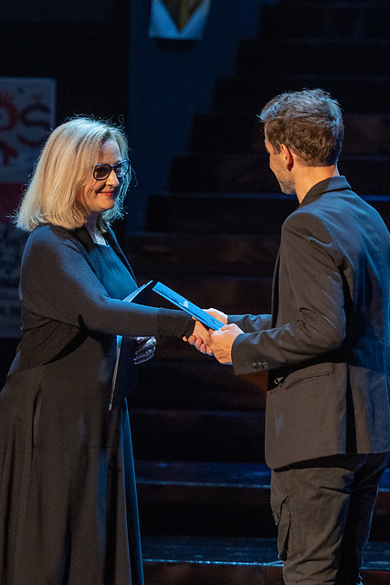 Na fotografiji: Nataša Barbara Gračner (v imenu Sebastijana Horvata) ob prejemu Borštnikove nagrade za režijo uprizoritve Cement v produkciji Slovenskega narodnega gledališča Drama Ljubljana