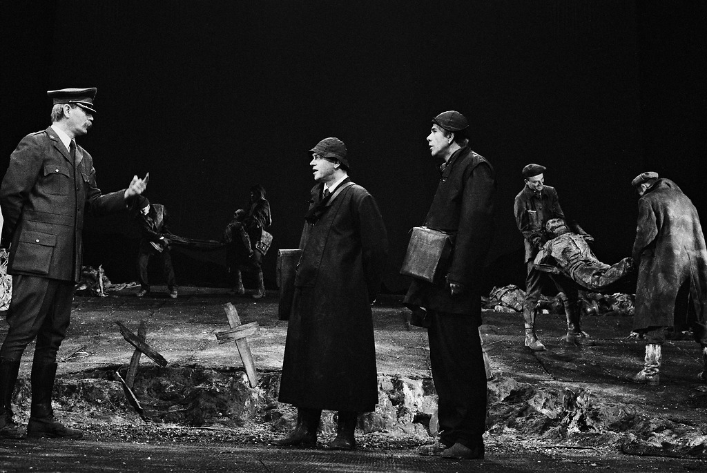 Na fotografiji: Branko Ličen, Bine Matoh, Ivo Barišič, v ozadju Iztok Mlakar, Jože Hrovat, Rastko Krošl in Radoš Bolčina v predstavi Ljubezen dobrega moža v režiji Bojana Jablanovca.