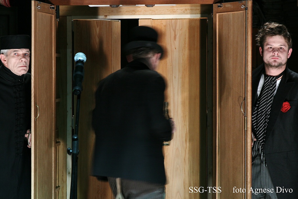 Na fotografiji: Ivo Barišič, Janko Petrovec in Primož Forte v predstavi Samomorilec v režiji Eduarda Milerja.