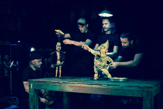 Alfred Jarry: Kralj Ubu. Dezorzovo lútkové divadlo, 14. 12. 2017, režiser: Gejza Dezorz; na sliki: Ľuboš Kostelný, Marián Mitaš, Kamil Kollárik, Alexander Maďar, 2