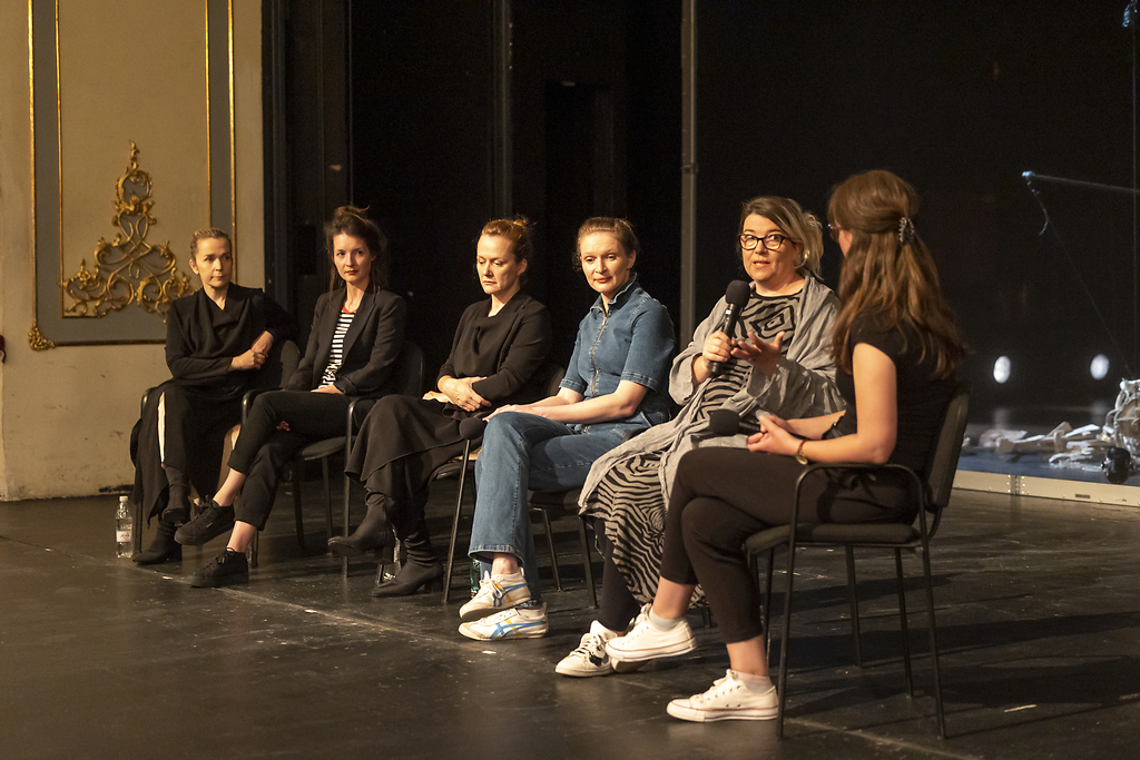 Na fotografiji: Maja Kunšič, igralka, Sara Slivnik, scenografka, Katja Povše, igralka, Špela Frlic, igralka, Ivana Djilas, režiserka in Kaja Novosel, moderatorka