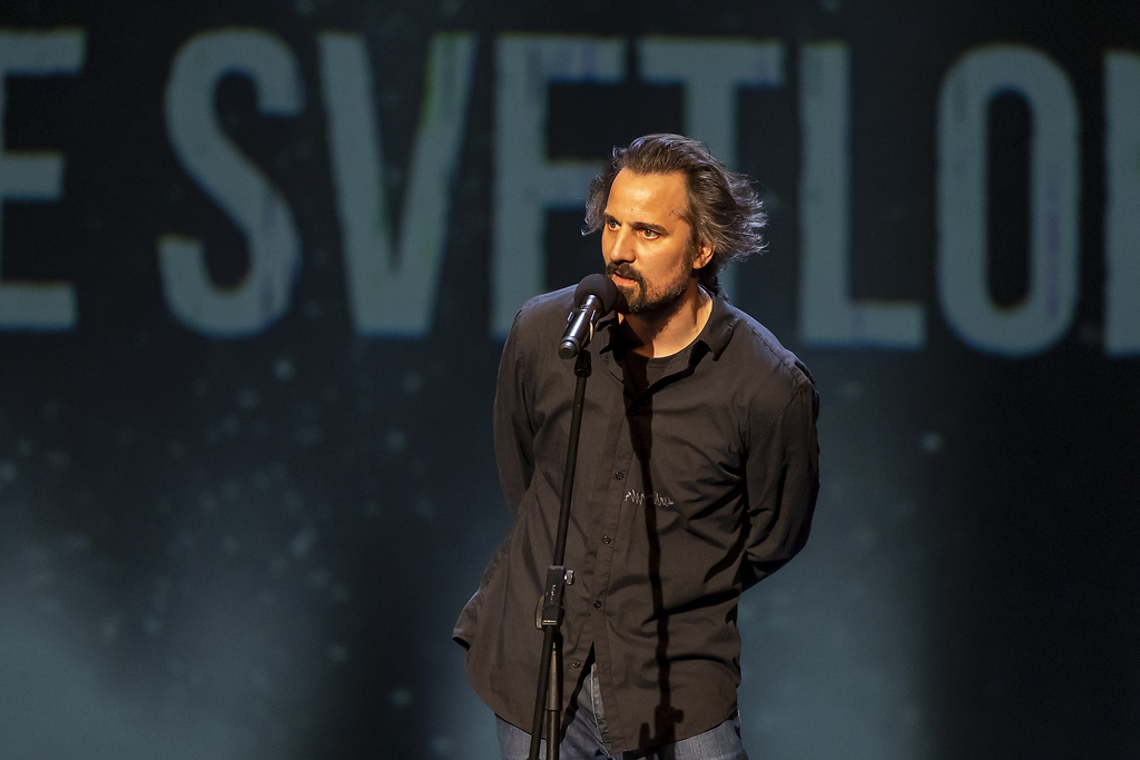 Na fotografiji: Kolektiv Son:DA in Toni Soprano Meneglejte ob prejemu Borštnikove nagrade za oblikovanje svetlobe in videa za uprizoritev Kdo se boji Virginie Woolf? v produkciji Mini teatra in Mestnega gledališča Ptuj