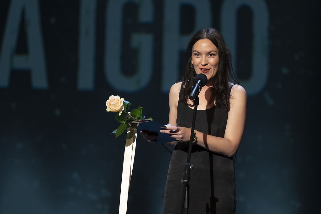 Na fotografiji: Tamara Avguštin ob prejemu Borštnikove nagrade za igro za vloge Brata Leona in drugih likov v predstavi Frančišek v produkciji Mestnega gledališča Ptuj in Rachel Donelan v predstavi Zaprta študija. "New Constructive Ethics" v produkciji Prešernovega gledališča Kranj