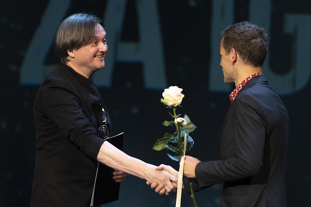 Na fotografiji: Branko Šturbej ob prejemu Borštnikove nagrade za igro za vlogo Georgea v predstavi Kdo se boji Virginie Woolf? v produkciji Mini teatra in Mestnega gledališča Ptuj