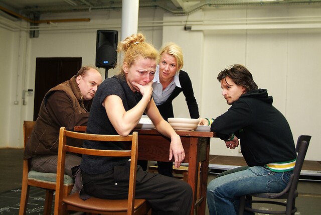 Na fotografiji: Nataša Matjašec Rošker, Tjaša Železnik Aljoša Ternovšek, Gojmir Lešnjak v predstavi Raztrganci/učenci in učitelji duše v režiji Sebastijana Horvata.