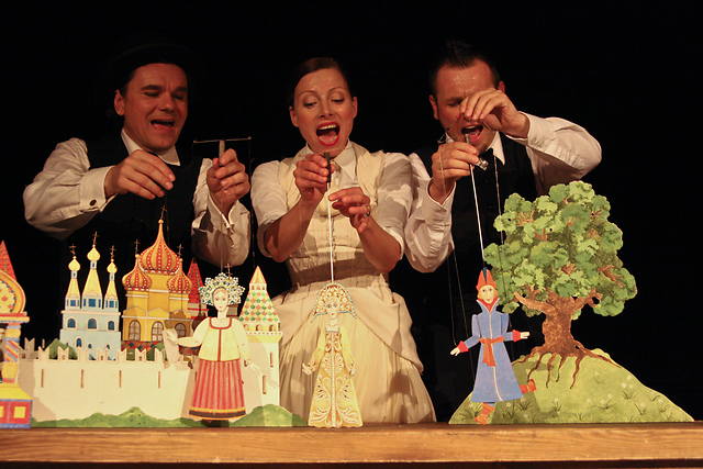 Na fotografiji: Nataša Matjašec Rošker, Ivica Knez in Luka Hrvatin v predstavi Pravljica o carju Saltanu v režiji Aleksanderja Anurova.