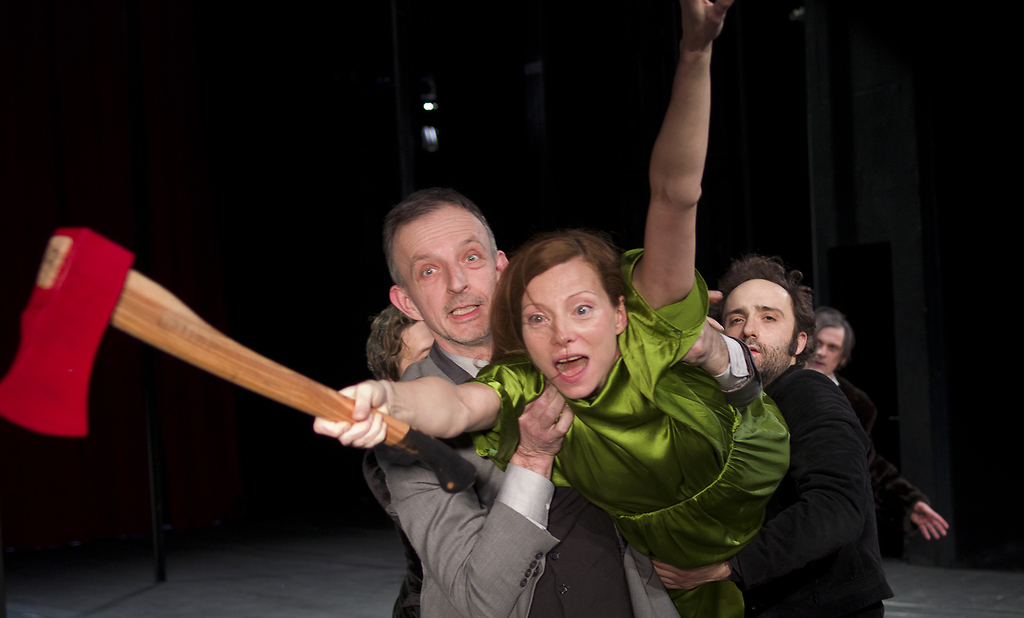 Na fotografiji: Nataša Matjašec Rošker, Davor Herga, Nejc Robert in Vladimir Vlaškalić v predstavi Mojster in Margareta v režiji Janusza Kice.