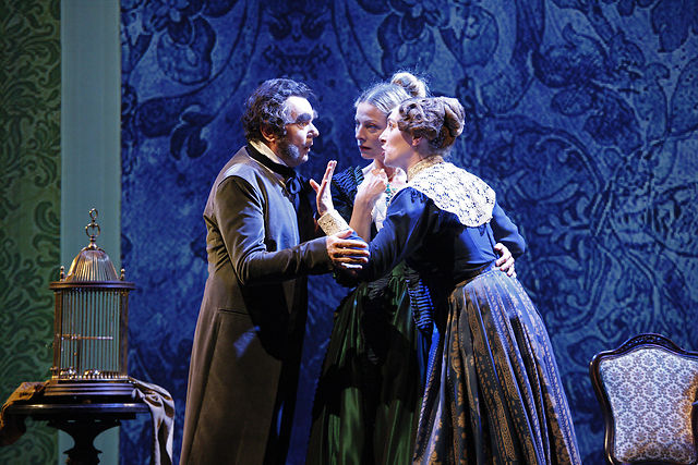 Na fotografiji: Nataša Matjašec Rošker, Ivica Knez in Maša Žilavec v predstavi Mrtve duše v režiji Ivana Popovskega.