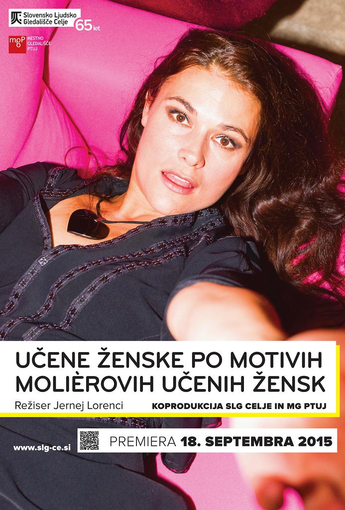 Pia Zemljič (Filaminta) na plakatu uprizoritve Učene ženske po motivih Molièrovih Učenih žensk v režiji Jerneja Lorencija in produkciji Slovenskega ljudskega gledališča Celje in Mestnega gledališča Ptuj