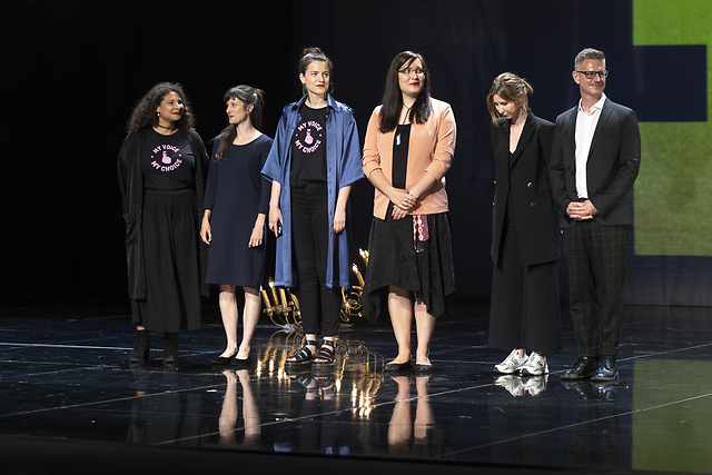 Na fotografiji: Ekipa predstave Spolna vzgoja II v režiji Tjaše Črnigoj ob prejemu Borštnikove nagrade za posebni dosežek po presoji žirije