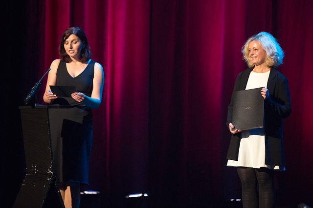 Podelitev nagrade Društva gledaliških kritikov in teatrologov Slovenije. Barbara Skubic, predstavnica DGKTS, in Tina Kosi, direktorica SLG Celje, ob prejemu nagrade DGKTS za najboljšo predstavo v sezoni 2015/16 - Rose Bernd.