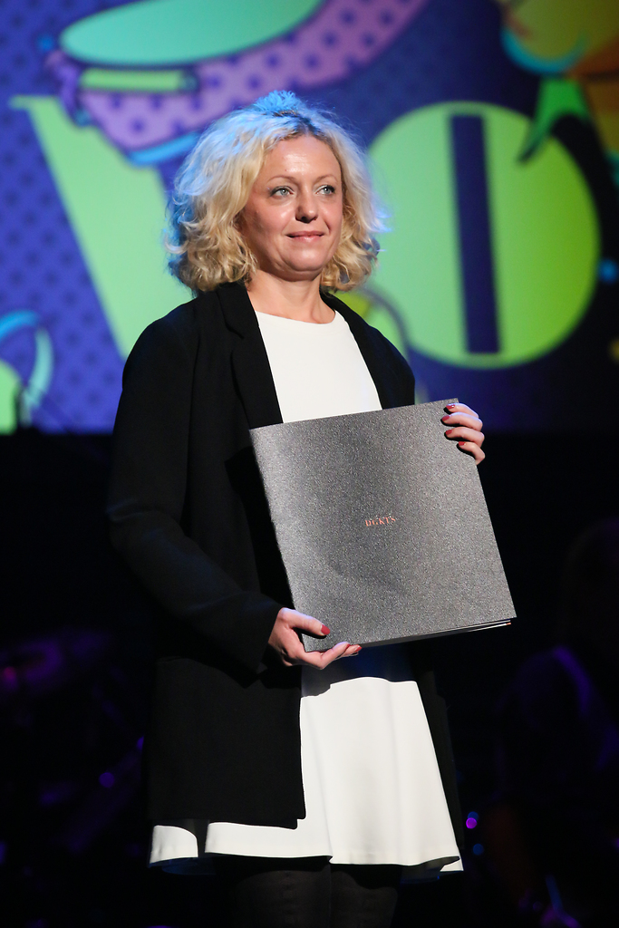 Podelitev nagrade Društva gledaliških kritikov in teatrologov Slovenije. Tina Kosi, direktorica SLG Celje, ob prejemu nagrade DGKTS za najboljšo predstavo v sezoni 2015/16 - Rose Bernd SLG Celje.