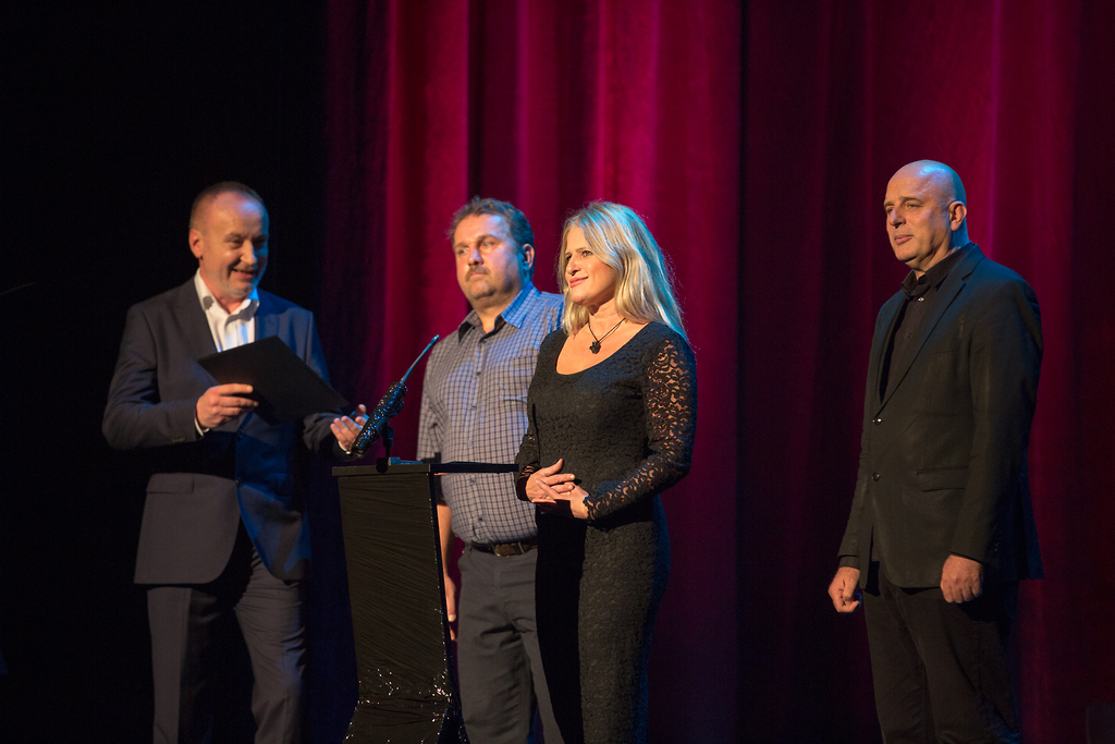 Tomaž Gubenšek, predstavnik žirije 51. Festivala Borštnikovo srečanje, in Primož Pirnat, Mojca Kumerdej in Dragan Živadinov ob prejemu nagrade za dramaturško obdelavo tekstovne predloge.