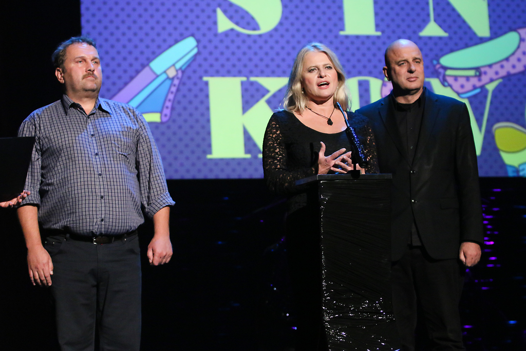 Tomaž Gubenšek, predstavnik žirije 51. Festivala Borštnikovo srečanje, in Primož Pirnat, Mojca Kumerdej in Dragan Živadinov ob prejemu nagrade za dramaturško obdelavo tekstovne predloge.