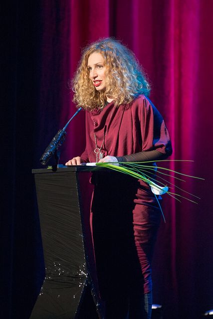Jelena Proković ob prejemu nagrade za kostumografijo v uprizoritvi Peer Gynt v izvedbi Mestnega gledališča ljubljanskega in Slovenskega stalnega gledališča Trst.