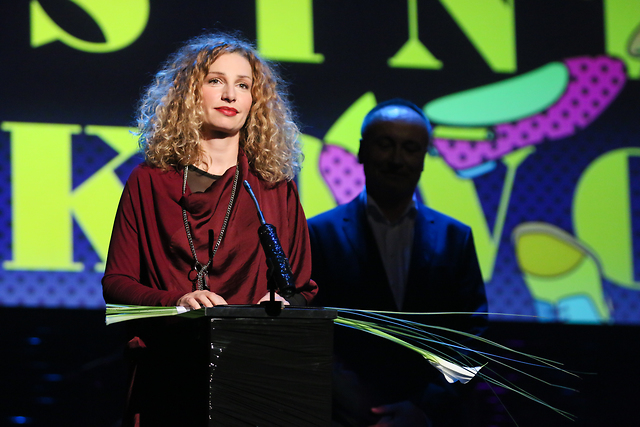 Jelena Proković ob prejemu nagrade za kostumografijo v uprizoritvi Peer Gynt v izvedbi Mestnega gledališča ljubljanskega in Slovenskega stalnega gledališča Trst.