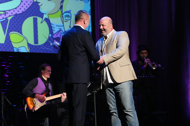 Jernej Šugman prejema Borštnikovo nagrado za igro za vlogo Ata Ubuja v uprizoritvi Kralj Ubu v izvedbi SNG Drama Ljubljana.