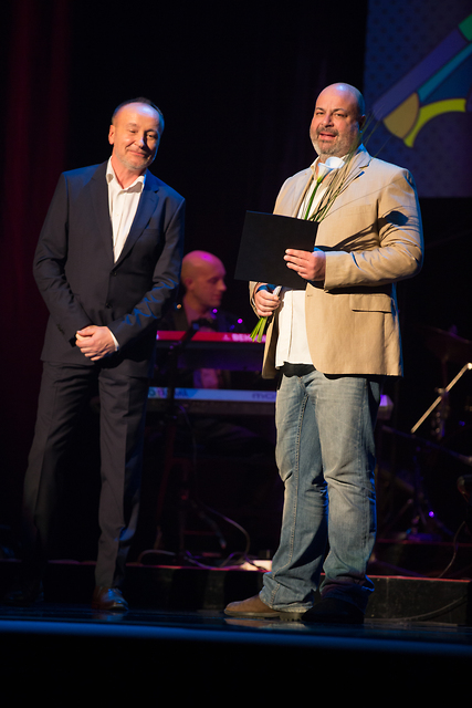 Jernej Šugman prejema Borštnikovo nagrado za igro za vlogo Ata Ubuja v uprizoritvi Kralj Ubu v izvedbi SNG Drama Ljubljana.