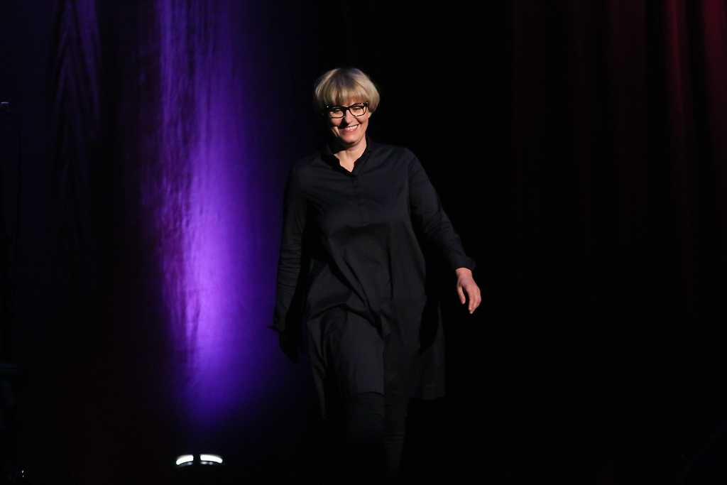 Mateja Koležnik prejema Borštnikovo nagrado za režijo uprizoritve Pred upokojitvijo v izvedbi Prešernovega gledališča Kranj