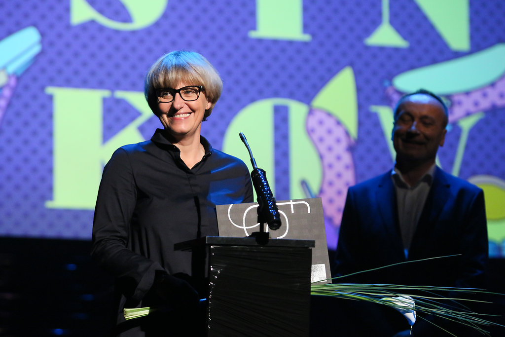 Mateja Koležnik prejema Borštnikovo nagrado za režijo uprizoritve Pred upokojitvijo v izvedbi Prešernovega gledališča Kranj