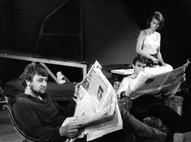 Na fotografiji: Dare Valič (Jimmy Porter), Ivan Jezernik (Cliff Lewis) in Marija Lojk (Alison Porter) v uprizoritvi V gnevu se ozri! Johna Osborna v režiji Mileta Koruna.