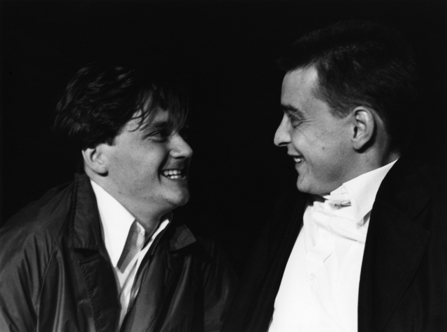 Branko Šturbej (Lazar, Lazarus) in Igor Samobor (Točaj); fotografija uprizoritve na malem odru v sezoni 1988/89