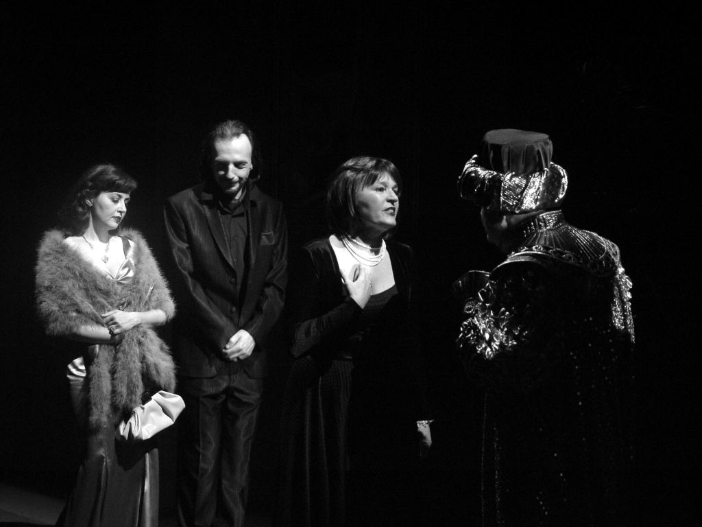 Na fotografiji: Ksenija Mišič (Dorimena), Davor Herga (Dorant), Milada Kalezić (Gospa Jourdain) in Vlado Novak (Gospod Jourdain)