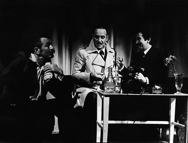 Na fotografiji: Dare Valič (Erazem Žulaj), Marjan Hlastec (Žurnalist Žajbelj in Marko Okorn (Načelnik) v Profesorju Klepcu Ferda Kozaka v režiji Janeza Pipana.