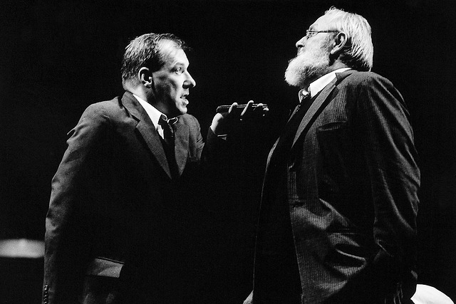 Na fotografiji: Dare Valič (General Ardalion Aleksandrovič Ivolgin) in Aleš Valič (Lukjan Timofejevič Lebedev) v Idiotu v režiji Mileta Koruna.