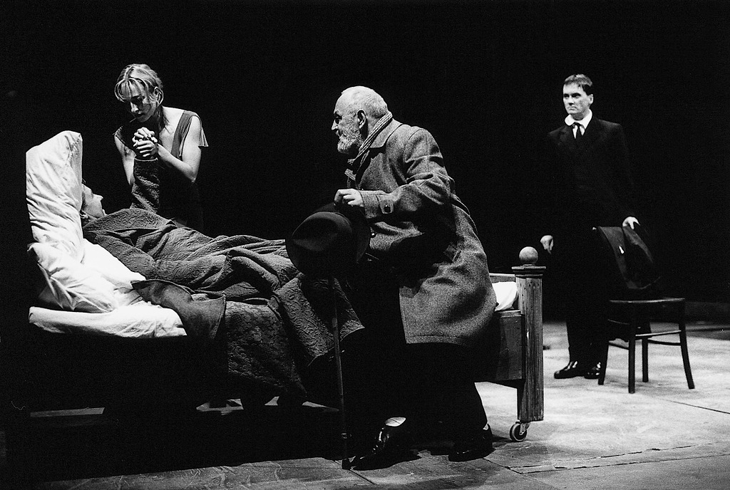 Na fotografiji: Dare Valič (Stric Albert) in Aleš Valič (Preiskovalni sodnik), Nataša Barbar Gračner (Leni), Branko Šturbej (Josef K.) v Procesu v režiji Janusza Kice.