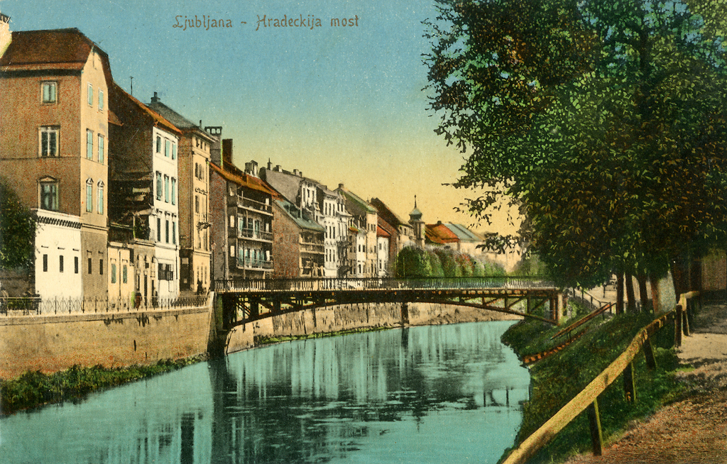 Čevljarski most v Ljubljani v času snovanja Dramatičnega društva, fotografija iz l. 1867.
