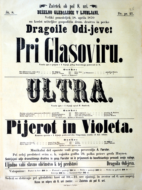 Gledališki list, ki vabi k trojnemu sporedu, veseli igri s petjem, veseli igri in komični opereti, se glasi na »korist učiteljice gospodičin dramatičnega društva in pevke«, s tem pa ilustrira dvojno vlogo Odijeve, ki tu nastopa v dveh pevskih vlogah.