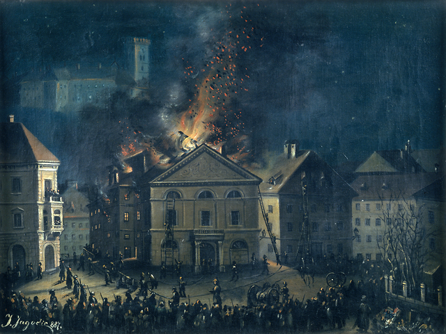 J. Jagodic, staro Deželno gledališče v plamenih leta 1887
