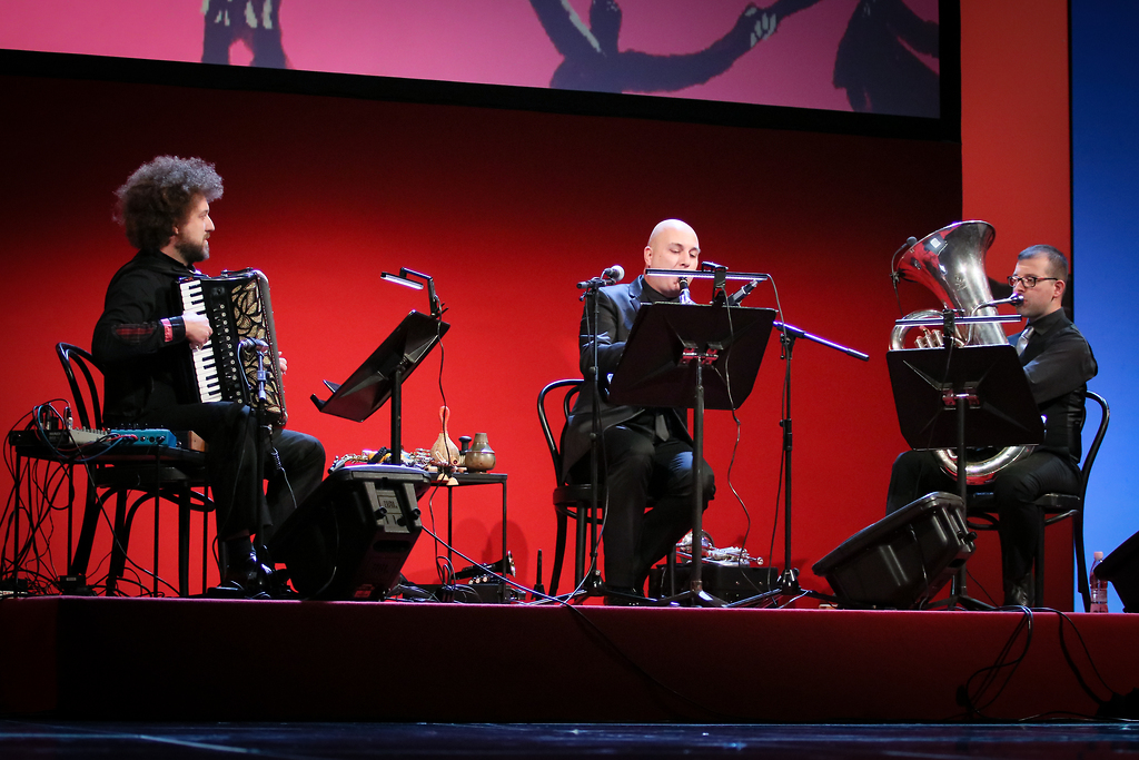 Janez Dovč, Boštjan Gombač in Goran Krmac, spremljevalni bend na zaključni slovesnosti 52. Festivala Borštnikovo srečanje 2017 v Veliki dvorani SNG Maribor.