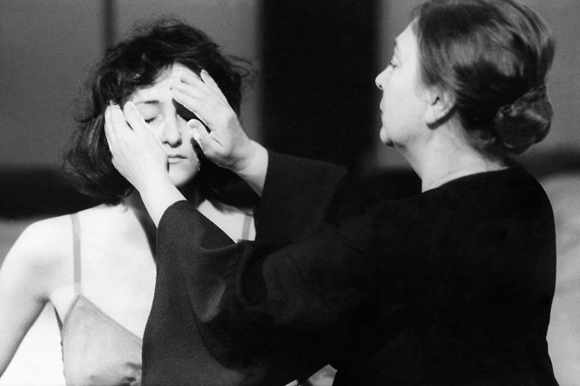 Saša Pavček (Dekle) in Štefka Drolc (Mati Zemlja) v Tišini osmega jutra, povzeto po besedilu Edvarda Kocbeka, v režiji Igorja Likarja in izvedbi SNG Drame Ljubljana.