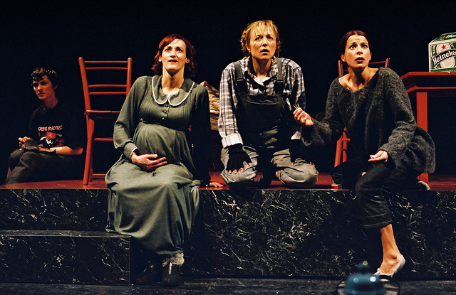Saša Pavček (Vera), Marko Plantan (Sonja Oniščenko), Nataša Barbara Gračner (Katja) in Maša Derganc (Tanja) v Četrti sestri Janusza Głowackega v režiji Slobodana Unkovskega in produkciji SNG Drama Ljubljana.