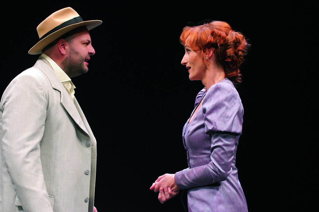 Saša Pavček (Katerina Osipovna Hohlakova) in Jernej Šugman (Dmitrij Fjodorovič Karamazov) v Bratje Karamazovi Dmitrija Fjodoroviča Karamazova in Mileta Koruna v režiji Mileta Koruna in produkciji SNG Drama Ljubljana.
