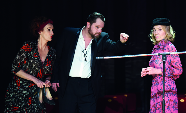 Saša Pavček (Helga), Jurij Zrnec (Oto) in Silva Čušin (Krista) v Valentiniadi Karla Valentina in Žanine Mirčevske, v režiji Eduarda Milerja in produkciji SNG Drama Ljubljana.