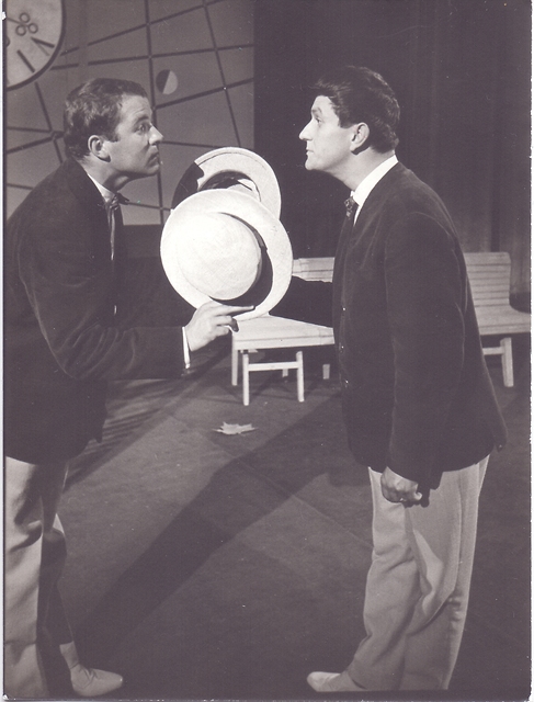 Janez Hočevar (Prvi gospod) in Branko Ivanc (drugi gospod) v Igricah Dominika Smoleta v režiji Žarka Petana in produkciji Odra 57.