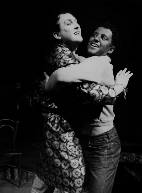 Janez Hočevar (Rio Rita) in Tone Homar (Princesa Grace) v Talcu Brendana Behana v režiji Mileta Koruna in produkciji Drame SNG v Ljubljani.
