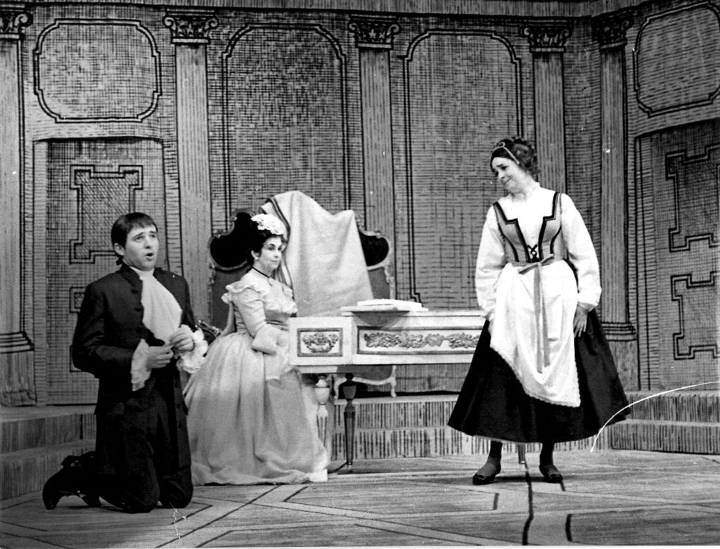 Janez Hočevar (Tonček), Ančka Levar (Rozala) in Majda Potokar (Nežka) v uprizoritvi Ta veseli dan ali Matiček se ženi Antona Tomaža Linharta v režiji Viktorja Molke in produkciji Drame SNG v Ljubljani.