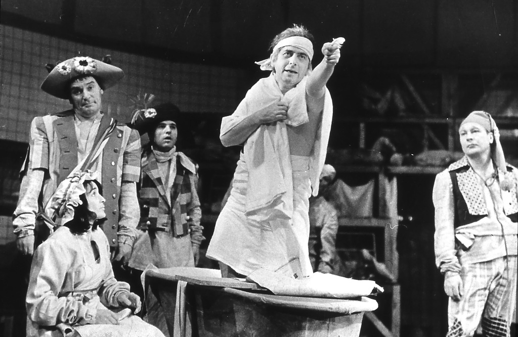Bert Sotlar (Kokol), Ivanka Mežan (Simone Evrard), Janez Hočevar (Cucurucu), Polde Bibič (Jean Paul Marat) in Marjan Hlastec (Polpoch) v uprizoritvi Zasledovanje in usmrtitev Jeana Paula Marata Petra Weissa v režiji Mileta Koruna in produkciji Drame SNG v Ljubljani.