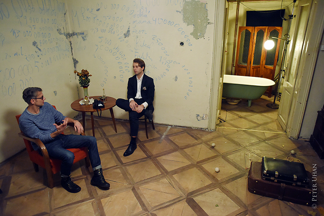 Nik Škrlec, igralec, in Primož Ekart, režiser uprizoritve Nemoč po motivih Heinricha Bölla in Janisa Varufakisa ter koprodukciji Zavoda Imagnirani in Mini teatra Ljubljana.